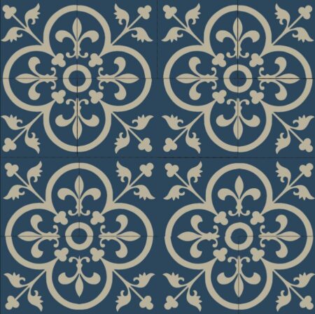 Le motif du carreau de ciment Fleuron bleu est composé de quatre carreaux qui, assemblés, forment un motif classique et élégant d’inspiration florale et baroque. Il se compose d’un fond bleu marine profond avec des motifs crème symétriques.